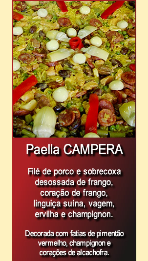 Mas para agradar a todos, inclusive aqueles que alimentam aversão aos simpáticos frutos do mar, temos a Paella CAMPERA, composta de filé de porco e sobrecoxa desossada de frango, coração de frango,