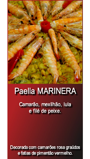 Como opção de prato que possui apenas frutos do mar, existe a Paella MARINERA, que é composta de camarão, mexilhão, lula e filé de peixe. Também é decorada com camarões rosa graúdos e fatias de