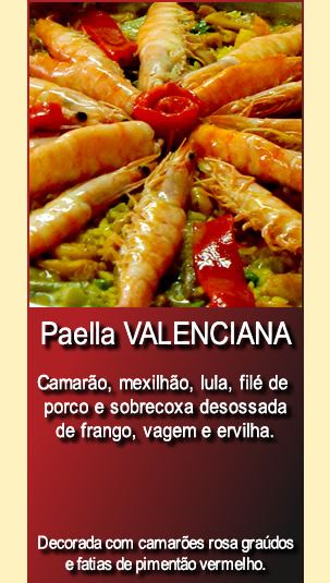 A Paella VALENCIANA, que foi a primeira a ser oferecida pela Magdalena Paellas, mistura frutos do mar com carnes e legumes. É composta de camarão, mexilhão, lula, filé de porco e sobrecoxa desossada de